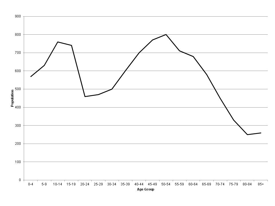In most regional areas there is an exodus of young people after Year 12. This shows up clearly when you look at the population by age. And for many communities, the trend is for this gap to get both deeper (more young people are leaving) and wider (there is also a net loss of people in their late 20s and 30s as well). The chart below shows an example of the number of people in each five year age group in 2011 from Cooma-Monaro Shire in NSW. From some 740 people in the 15-19 age group, the number falls to around 460 in the 20-24 age group.