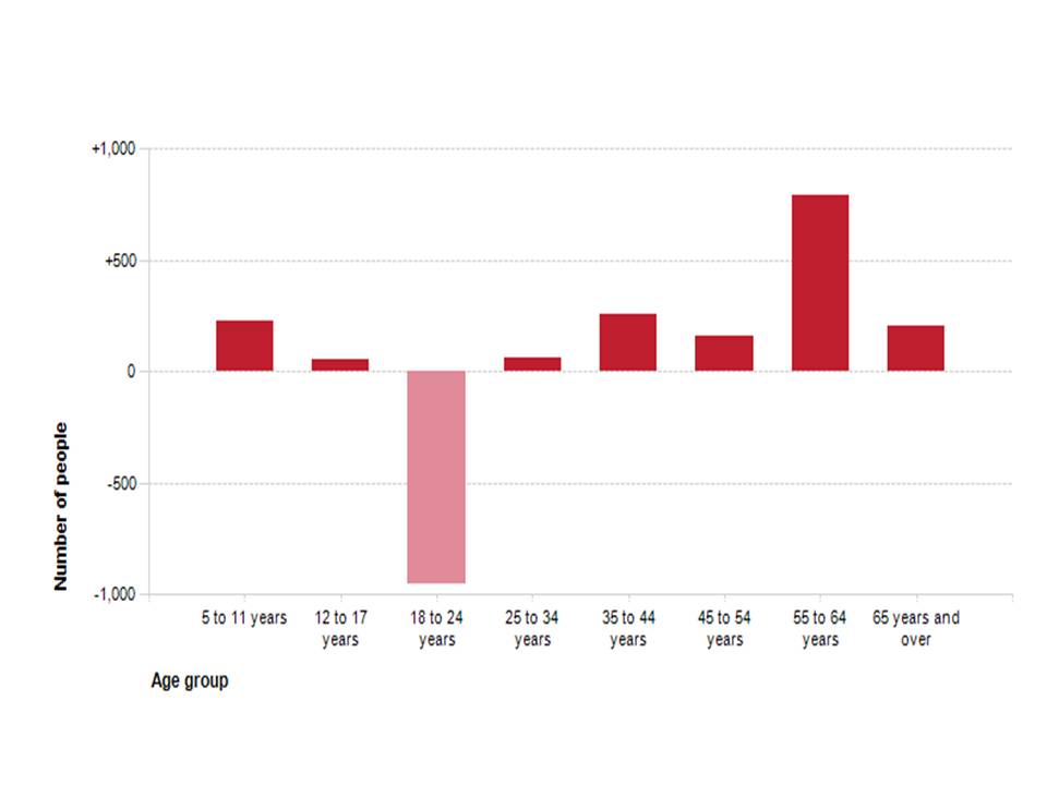 The graph below shows the net flow of people by age group for Eurobodalla Shire in NSW. It shows a net loss of almost 1,000 people in the 18-24 age group from the Shire between 2006 and 2011, while there were net gains in all other age groups.
